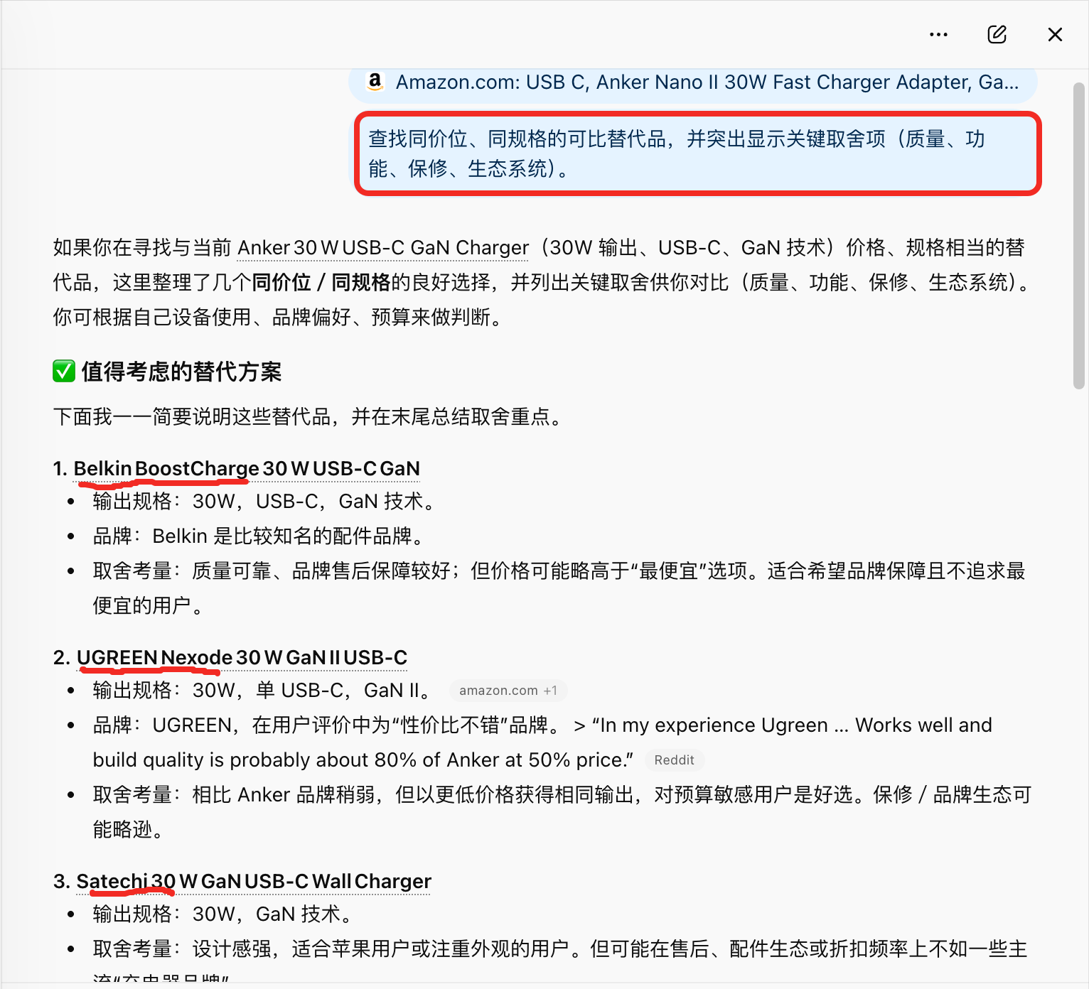 查找同价位、同规格的可比替代品,并突出显示关键取舍项(质量、功能、保修、生态系统)。