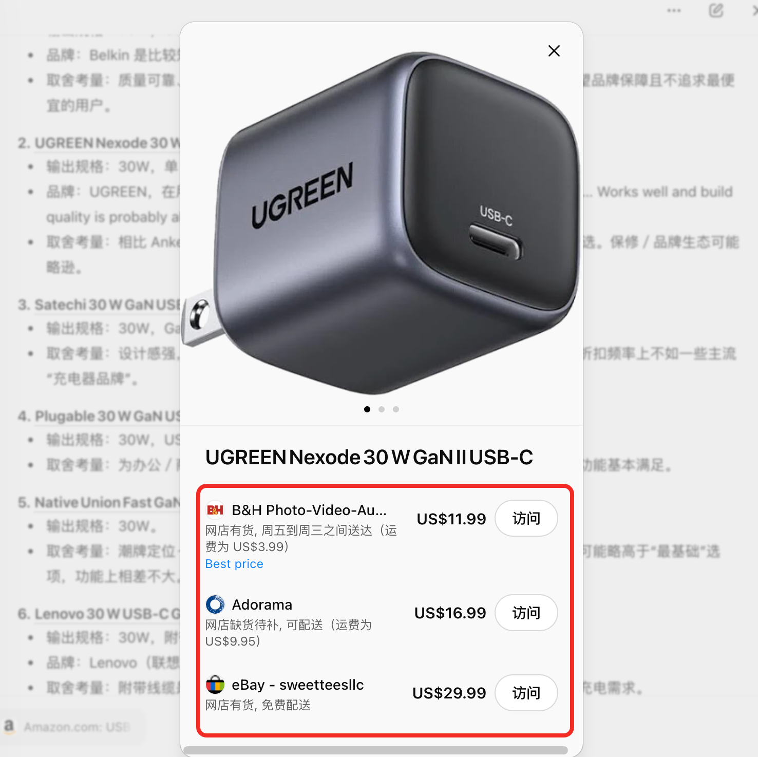 如下图,我点击绿联这个产品的连接,马上出现绿联不同渠道的产品购买页