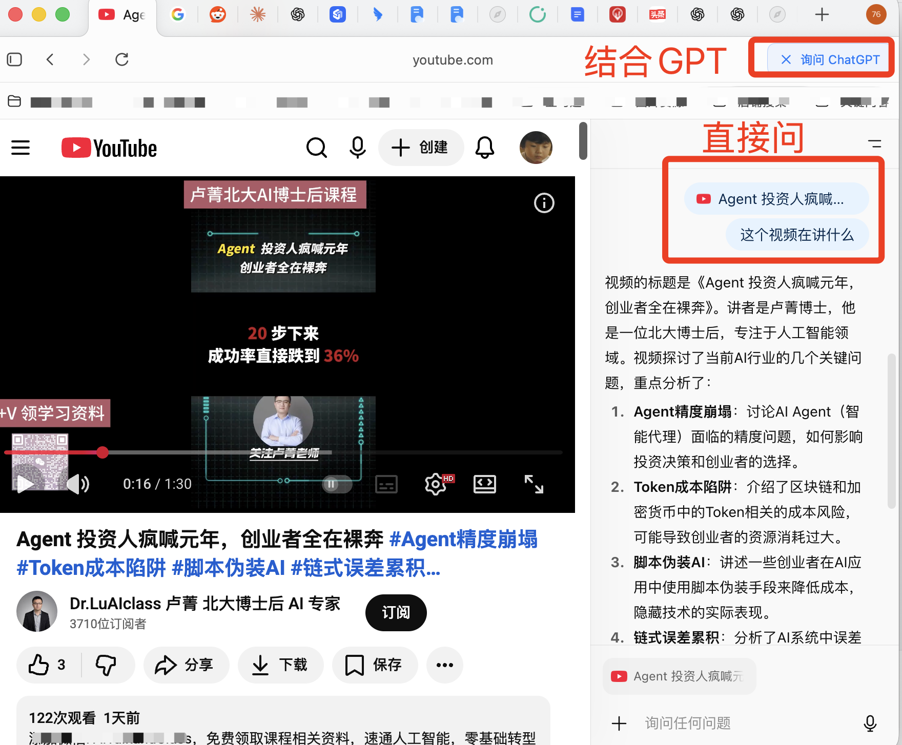 像我经常看YouTube视频,现在ChatGPT是能够直接学习视频的内容,然后总结视频,你再也不用切换了