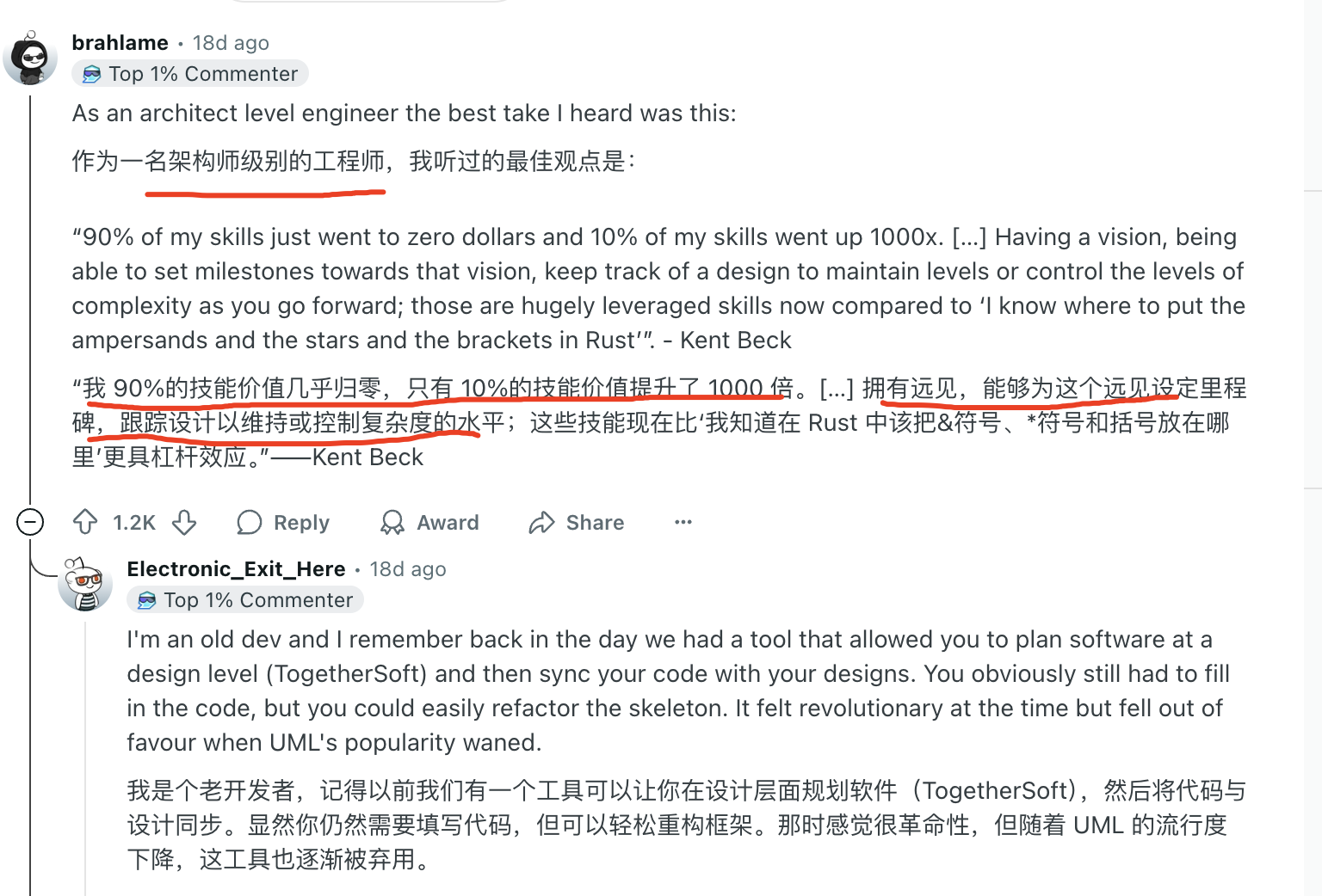 这些技能在 AI 面前几乎不值钱了。但是他剩下的那10%的技能,价值反而涨了1000倍。