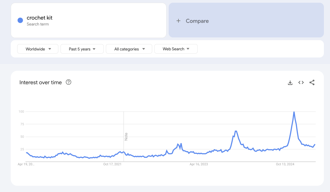 你看,早在 2020 年,Google Trends 就显示出“crochet kit”(钩针套件)