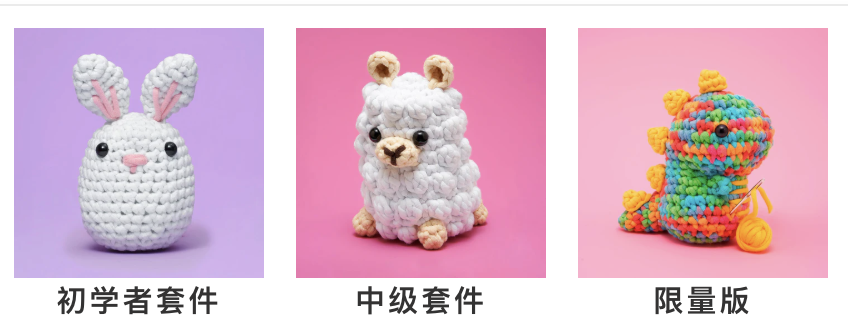每个套件都包含了详细的视频教程、必要的工具(钩针、线、填充物等),