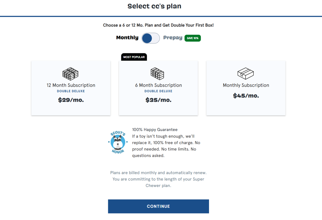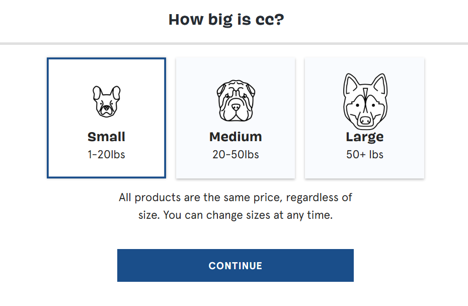 用户可选择根据狗狗体型定制,订阅价格为 45美元/月,若年付则每月降至 29 美元。