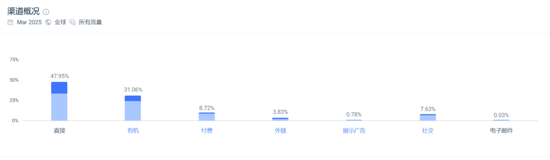 我们看到这个网站的主要流量来源是直接流量占比接近 48%,有机流量占比31%,