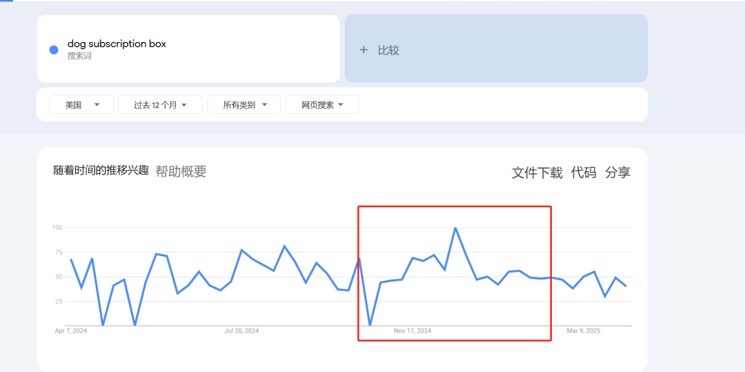 在Google trends中放入关键词“dog subscription box”呈持续增长趋势,