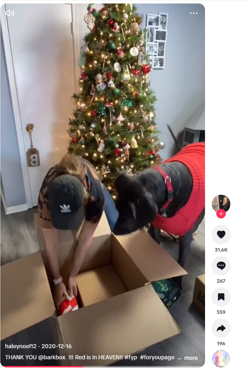 如@haleynoel12 账号发布的视频中,主人和狗狗一起开箱的的画面播放量达 260 万,点赞数3.1 万。