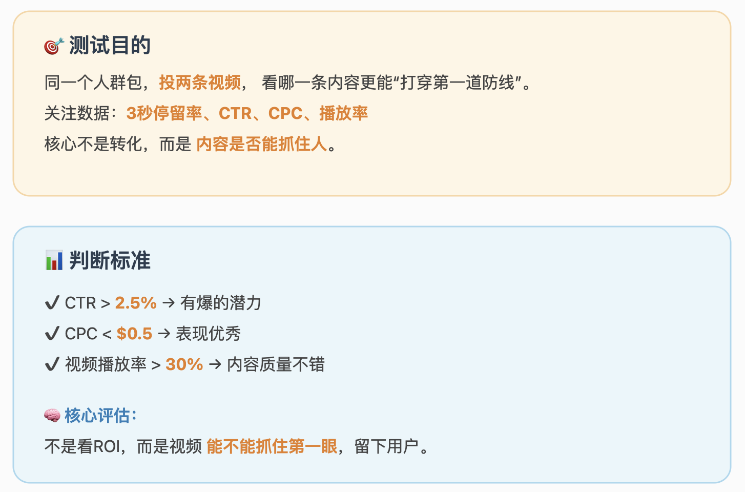 • 看哪一条的3秒停留率、CTR(点击率)、CPC(点击成本)更优