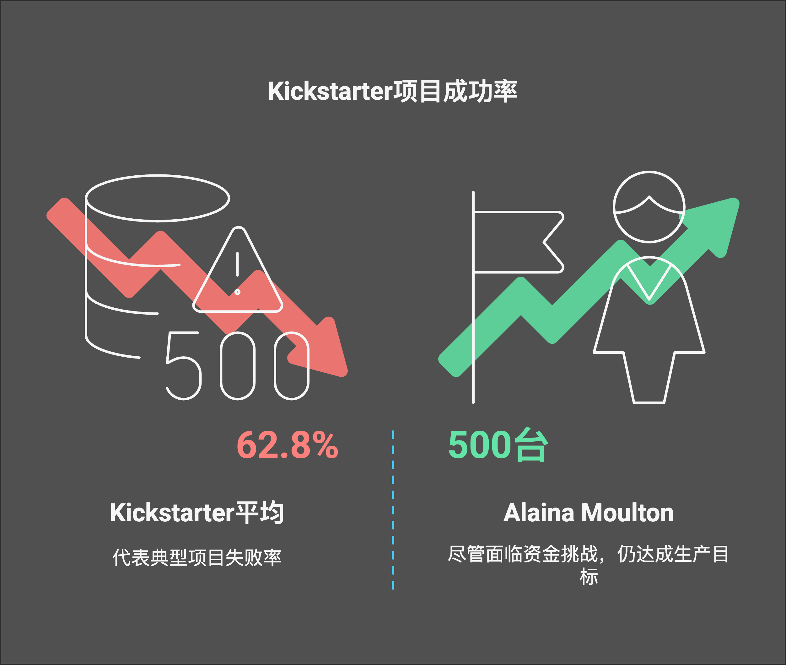 众筹结果:产品在Kickstarter项目未达众筹目标,但通过部分资助和贷款完成首批500台生产(3周售罄)。